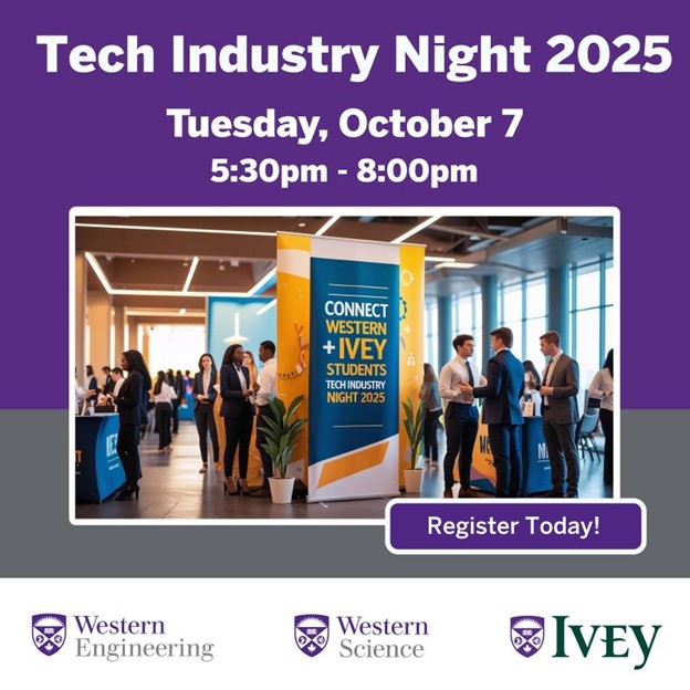 Hosted by Western Engineering, Science, & Ivey Career Services, this event offers students the chance to engage with employers from various areas of the technology sector. Through company presentations and networking, you'll have the opportunity to build professional relationships and learn directly from industry experts. Employers will give brief introductions to their companies, followed by a dedicated time for networking. Plus, pizza and light refreshments will be served!